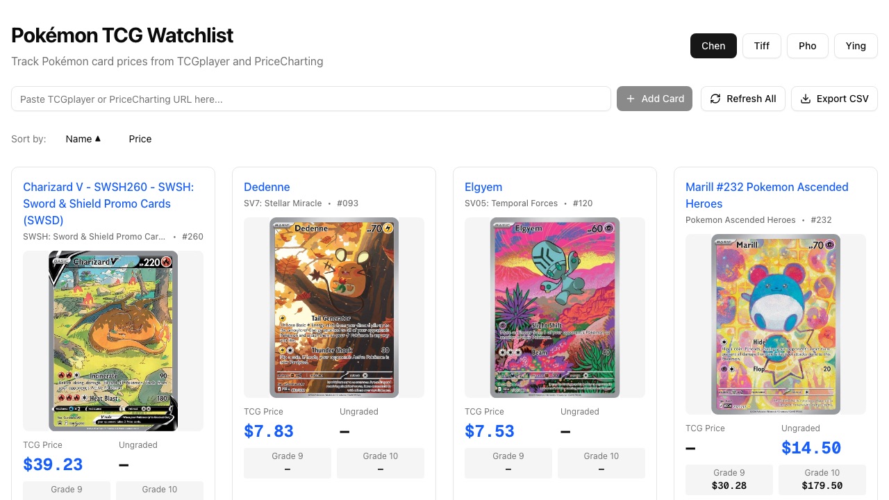 Track card prices from TCGplayer and PriceCharting. Build a watchlist and monitor trends.